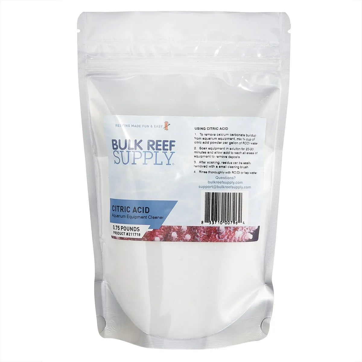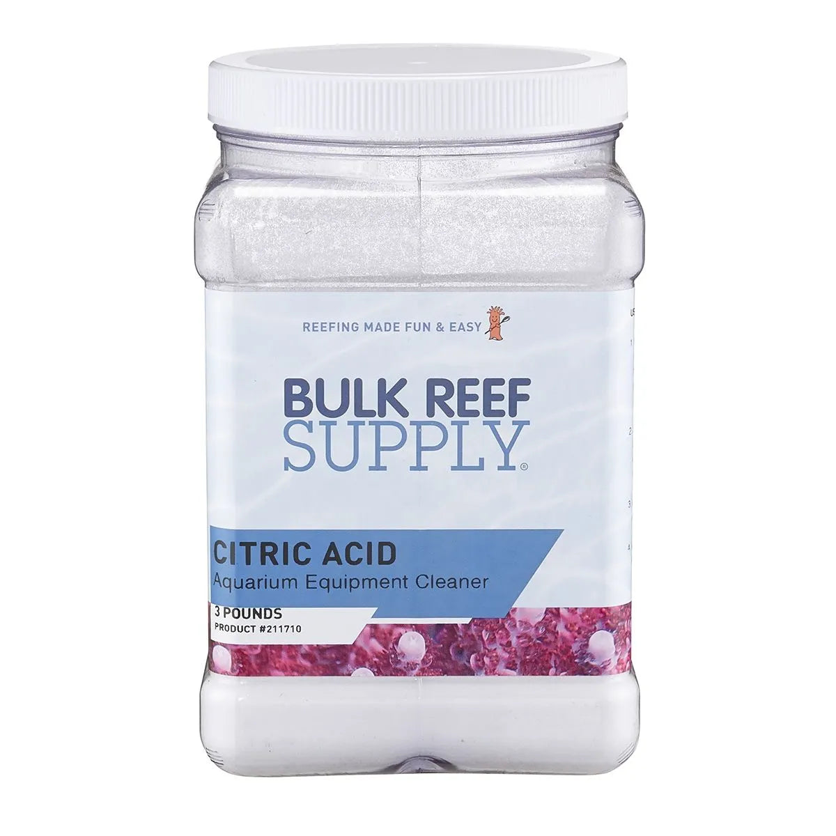 Ácido cítrico en presentación de 32 oz, 64 oz o 128 oz, diseñado para eliminar depósitos calcáreos y algas coralináceas de bombas, cabezales y otros equipos, sin usar ácidos agresivos