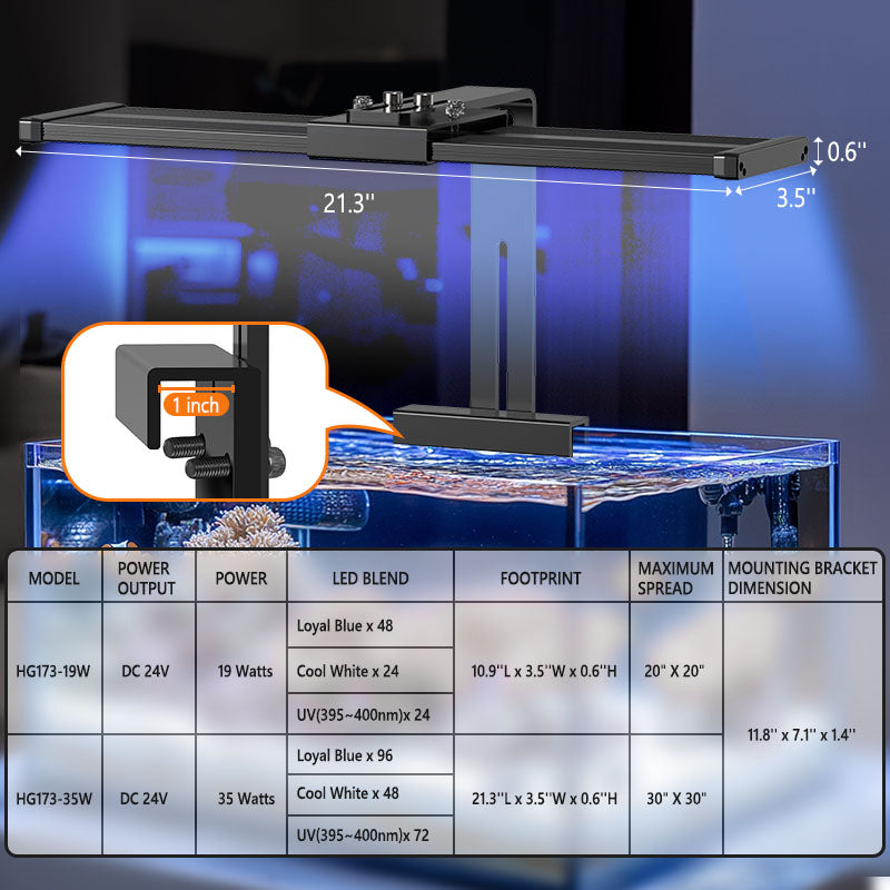 - 19 W – 48 Royal Blue + 24 Cool White + 24 UV LEDs. Recomendado para acuarios de 30–50 cm (12–20″).