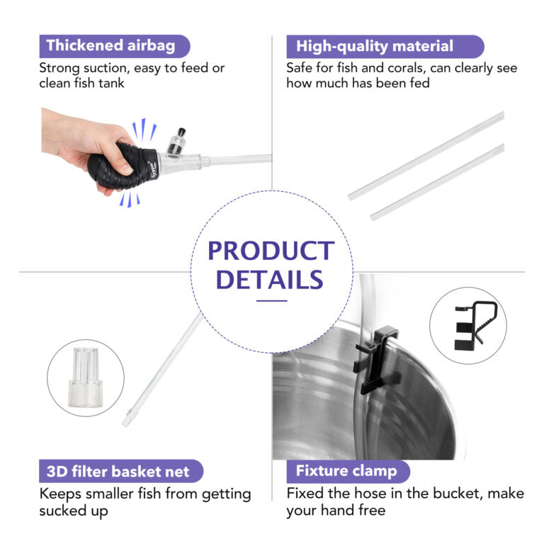- Cambio de agua rápido: presiona la pera para iniciar el sifón y extraer agua sin esfuerzo, y con cesta de protección para evitar aspirar peces o plantas.