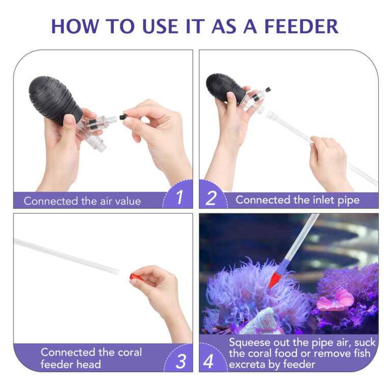 Herramienta todo-en-uno para mantener tu acuario: cambio de agua, limpieza de gravas, alimentación de corales y eliminación de desechos.