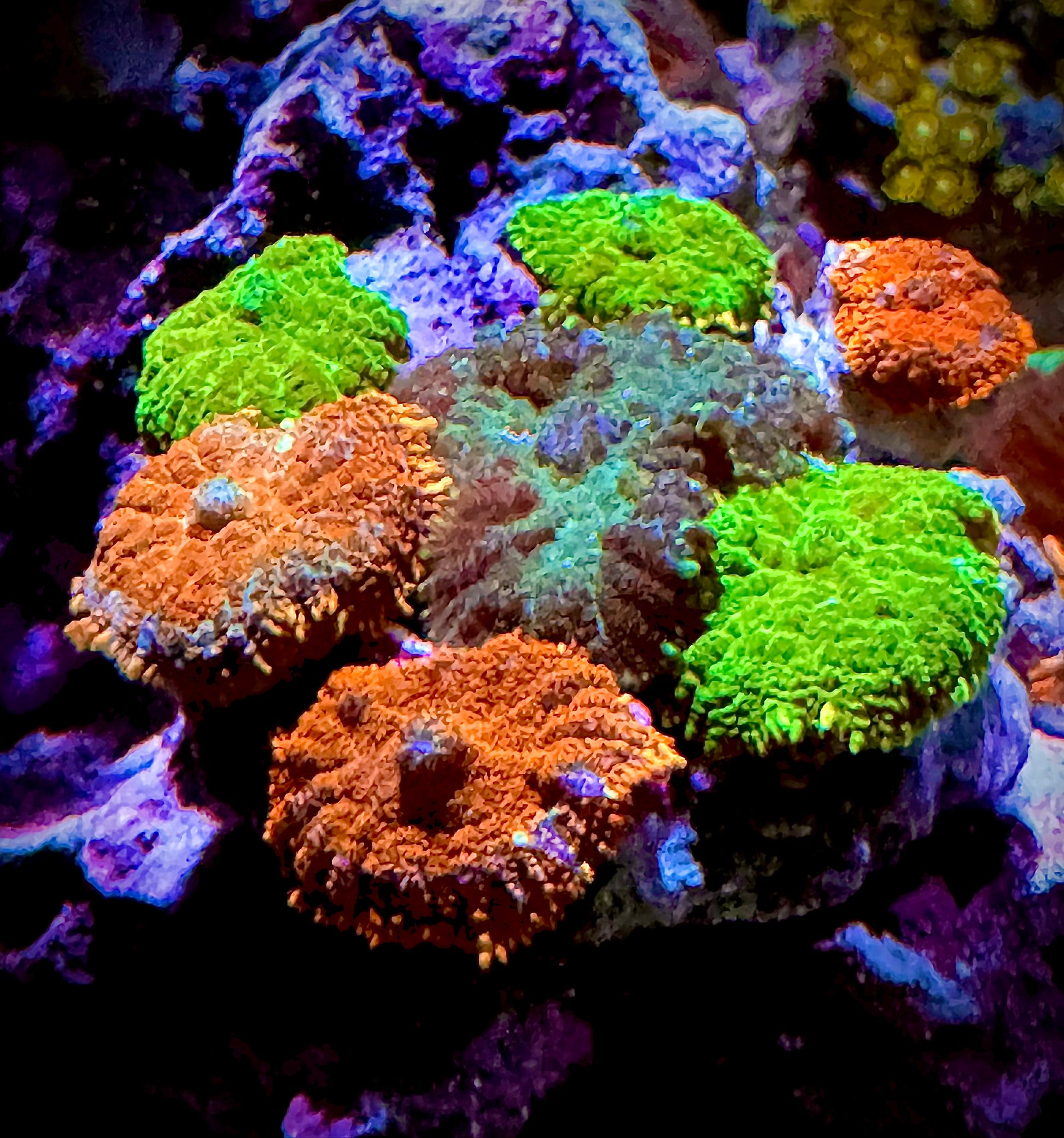 La Rhodactis es un coral blando tipo mushroom que se caracteriza por sus pólipos grandes, carnosos y texturizados, con colores vibrantes que van del rojo al verde intenso, dependiendo de la variante. Su movimiento suave con la corriente aporta dinamismo y un toque llamativo a cualquier acuario de arrecife.